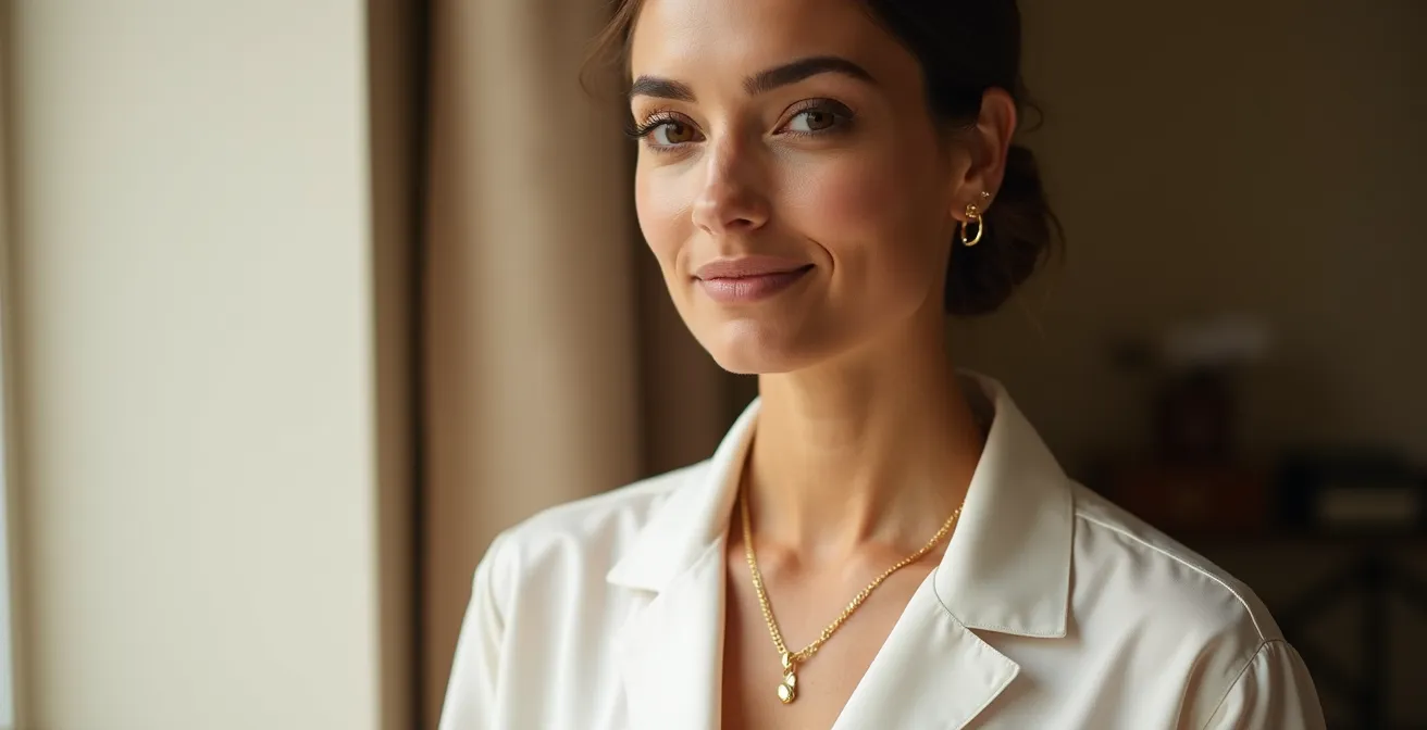 En milieu professionnel, chaque détail de votre apparence envoie un message. Une parure complète, c’est-à-dire un ensemble parfaitement assorti de collier, boucles d’oreilles et bracelet, peut créer un « bruit visuel » involontaire. Au lieu de souligner votre professionnalisme, elle risque de détourner l’attention de votre discours. L’œil de votre interlocuteur est attiré par la multiplicité des points brillants, ce qui peut inconsciemment être perçu comme un manque de sobriété ou une tentative de surcompensation. La crédibilité se nourrit de subtilité et de confiance ; un style surchargé peut suggérer le contraire.
