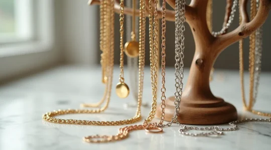 La prévention des frottements entre pièces exige une séparation physique. Les colliers s’emmêlent dès qu’ils sont stockés ensemble, créant des nœuds parfois impossibles à défaire sans endommager la chaîne. Suspendez-les individuellement ou placez chacun dans une pochette séparée. Les bracelets rigides peuvent se rayer mutuellement : empilez-les sur un support cylindrique recouvert de velours qui les maintient espacés.